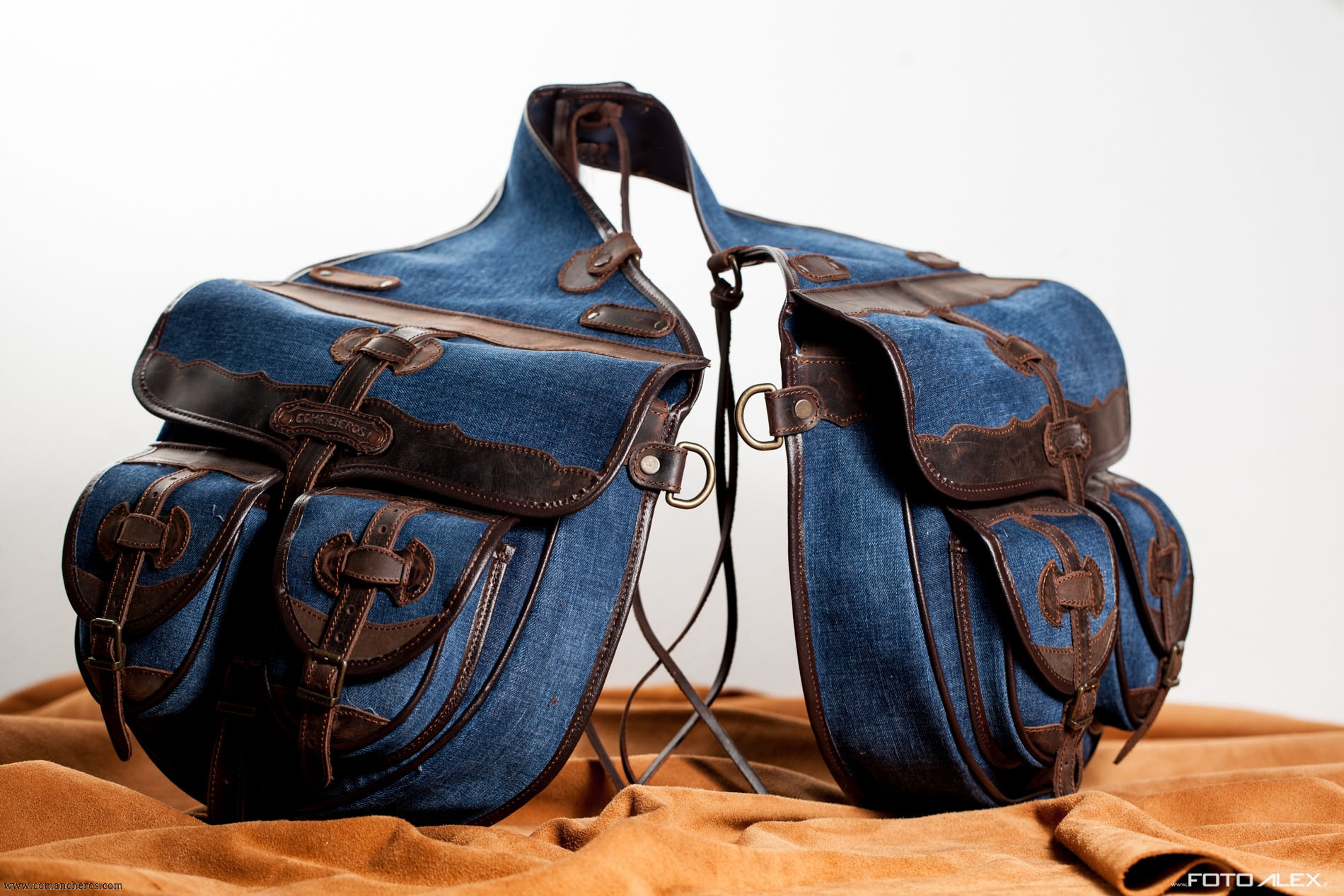Bisacce cavallo con taschini in jeans da mettere posteriormente alla sella.