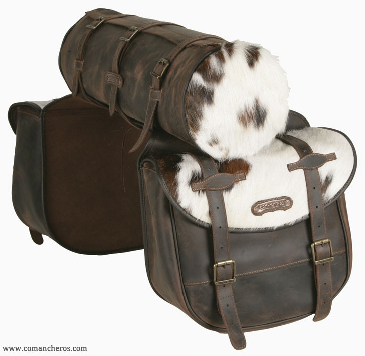 Originali queste bisacce con applicazioni di vero pelo di mucca dall'aspetto molto western, usate per lunghe passeggiate a cavallo.