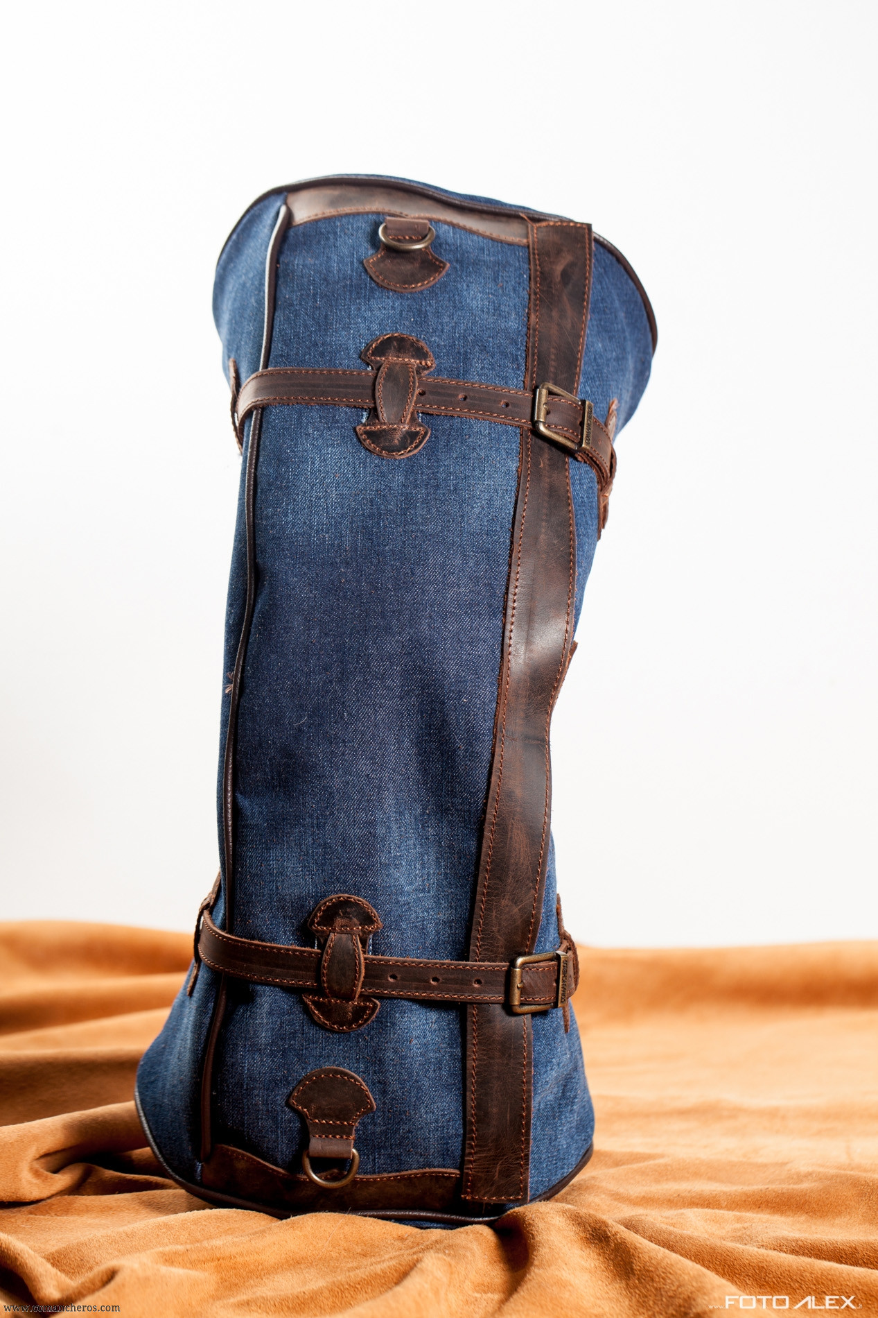Bellissima e originale questa banana in un jeans tecnico, molto robusto e impermeabile con rinforzi di cuoio nei punti di più usura.