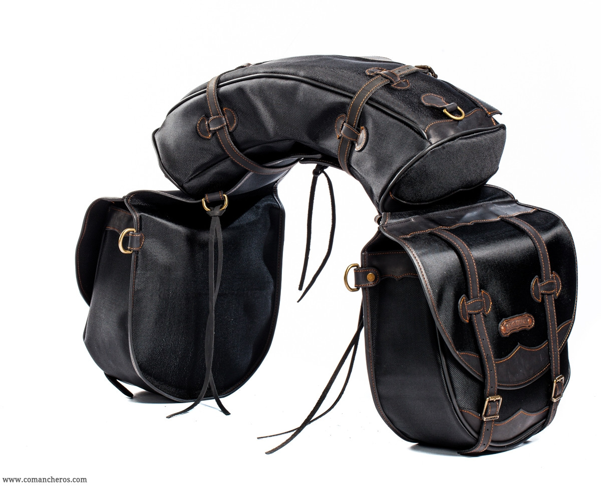 Completo bisacce con banana realizzata in speciale nylon STC nero. Leggero ma super impermeabile, ha inserti in pelle nei punti di maggiore usura che gli conferiscono una particolare aggressività, i cinturini sono in pelle e la banana si chiude con la cerniera, piace molto ai cowboys. Progettato e prodotto da Comancheros Italia.