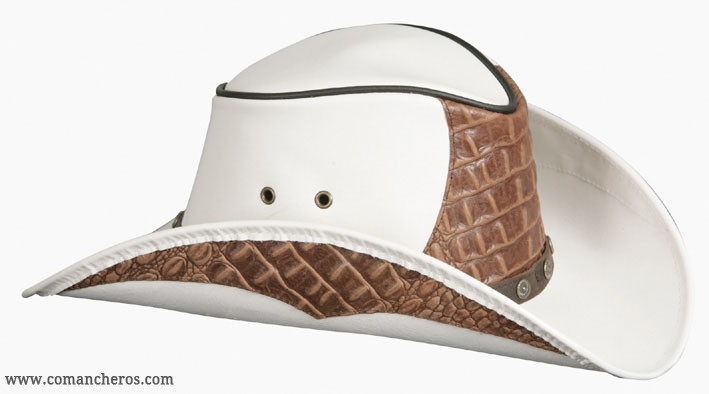 Candido pellame bianco e falda larga personalizzabile, profilata nella parte superiore con cinturino in cuoio e borchiette in ottone. Ecco un altro prodotto top realizzato dai nostri maestri artigiani. Le applicazioni di pelle in stampa di cocco sono senz’altro la particolarità di questo cappello country, realizzato in Italia. Taglia unica (S-XL) regolabile all'interno con fascia in pelle.