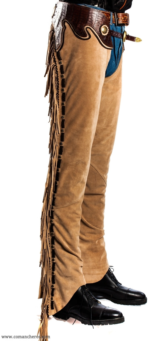 Chaps da reining professionale con riporti in pelle cocco. Alla particolare forma sono abbinate conchos brunite e invecchiate. Ai lati è applicata una treccia in camoscio con roselline in metallo che danno un tocco di eleganza. Tutti i motivi, le forme e i disegni sono progettati da Comancheros.
