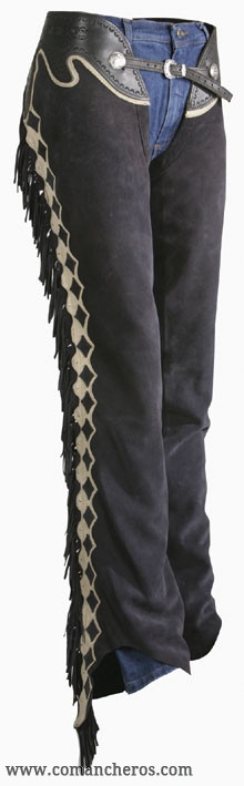 Chaps dall’innata eleganza, molto usata nelle competizioni internazionali. Realizzata in morbido camoscio blu, con accurato decoro laterale a contrasto, color ghiaccio, e borchie in color argento. I riporti sono in cuoio nero battuto a mano e marchiati Comancheros, la chiusura laterale ha due cerniere da 8 mm. Articolo CH073-L-BLU